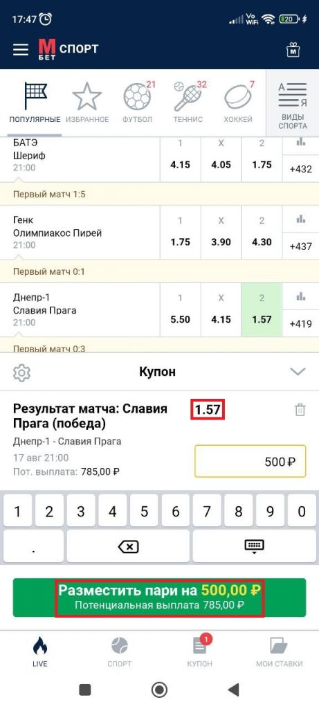 Для оформления пари необходимо зайти в раздел «Спорт» или LIVE. Выберите дисциплину, турнир и матч в линии. Если кликнуть по коэффициенту, прогноз попадет в раздел «Купон». Там можно выбрать вид — ординар, экспресс или система — указать сумму и сделать ставку.