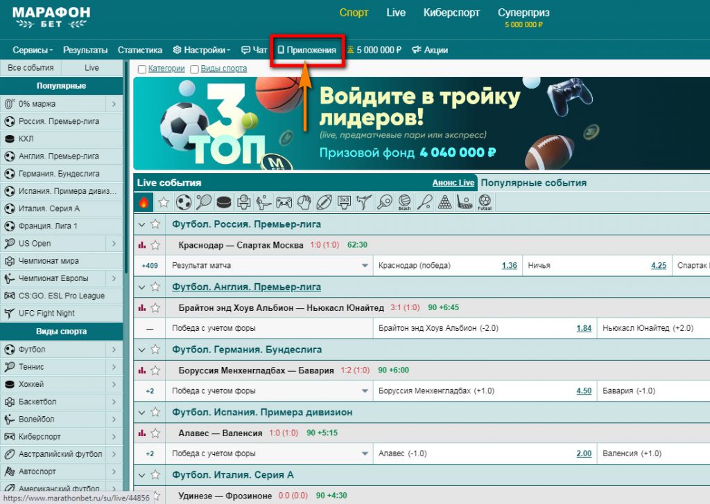 - Зайдите на официальный сайт marathonbet.ru. Откройте раздел «Приложения».