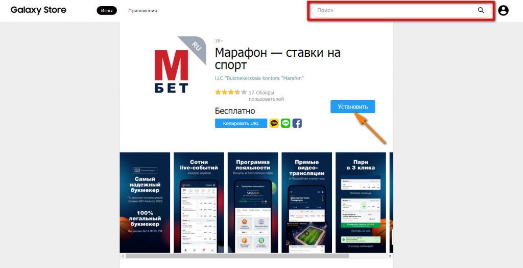 Ссылка для скачивания доступна на официальном сайте букмекера. При переходе игроку предложат открыть приложение магазина SAMSUNG. Далее останется нажать «Установить» и дождаться загрузки ПО.