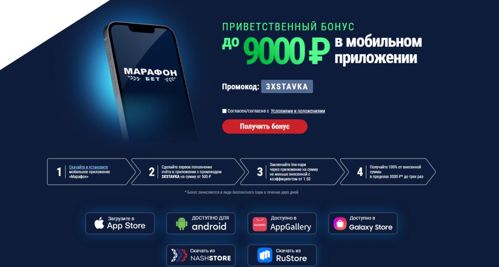 Букмекер регулярно обновляет список актуальных акций. Так, на сентябрь 2023 г. в БК «Марафон» новым игрокам дают до 9 000 рублей за установку мобильного приложения. Для получения этого бонуса следует: